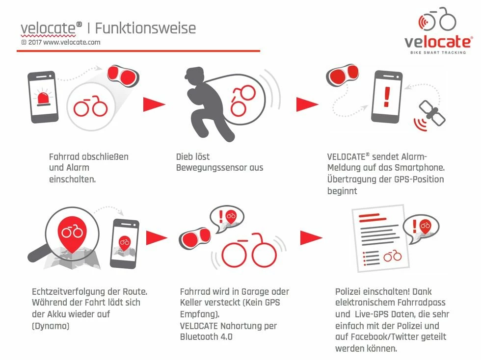 Grâce à un tracker GPS intégré, le feu arrière Velocate VC|one est un système de localisation fiable pour les vélos électriques volés. L’application pour smartphone “Velocate GPS” permet de relier et d’activer le tracker.